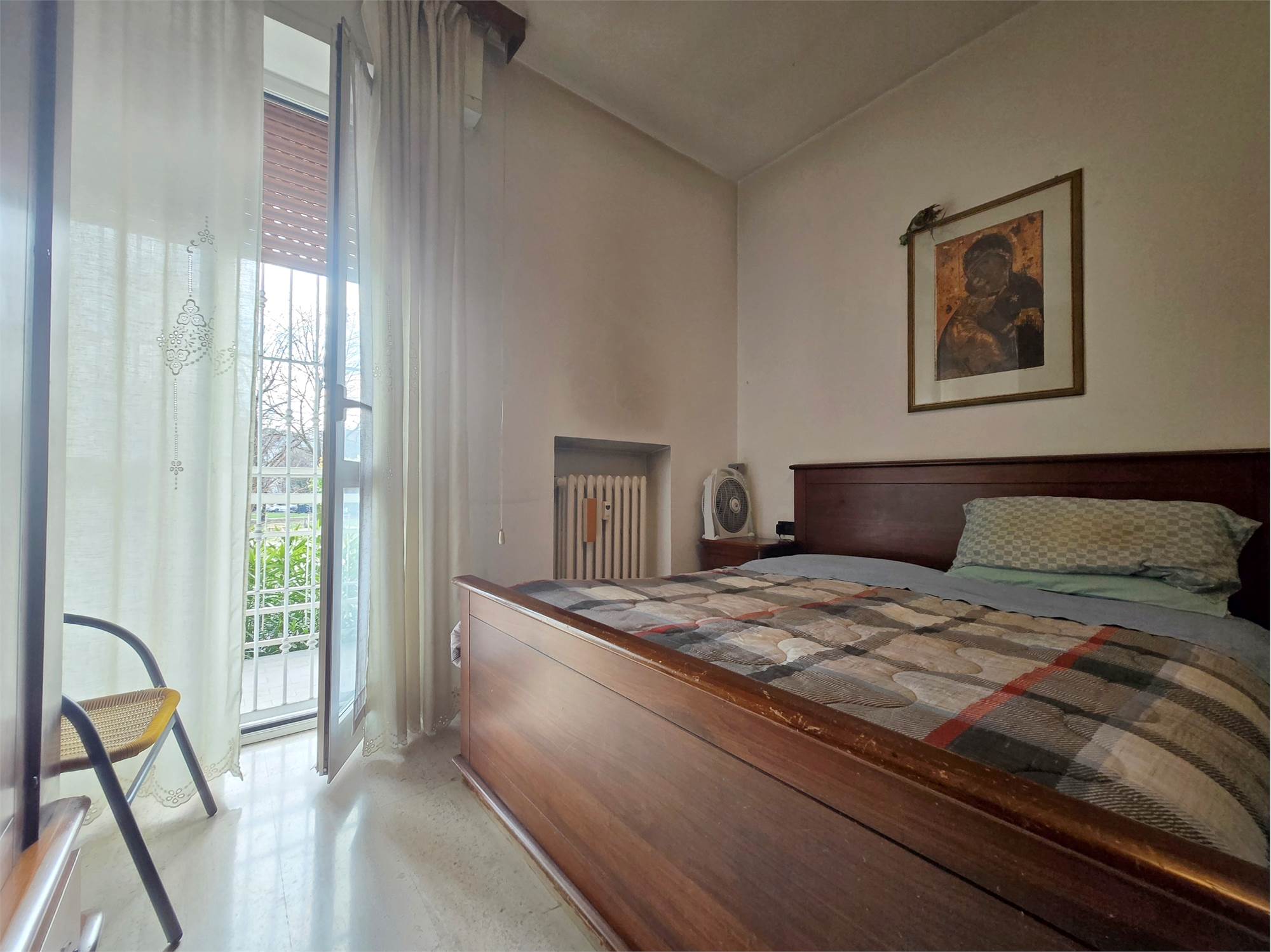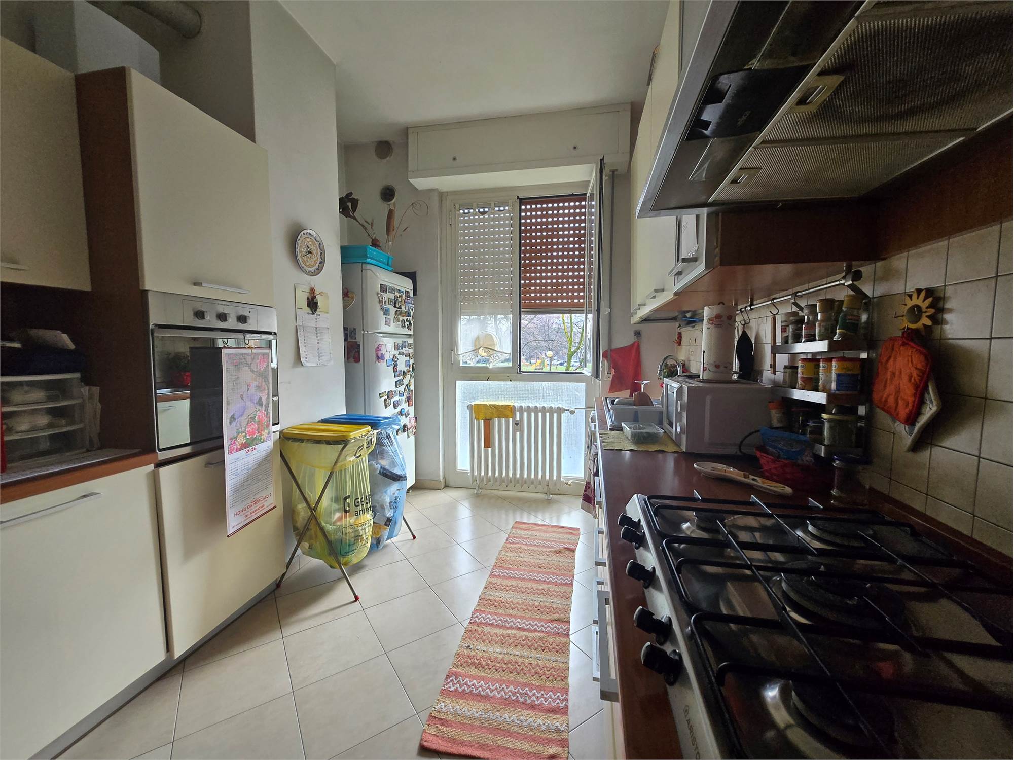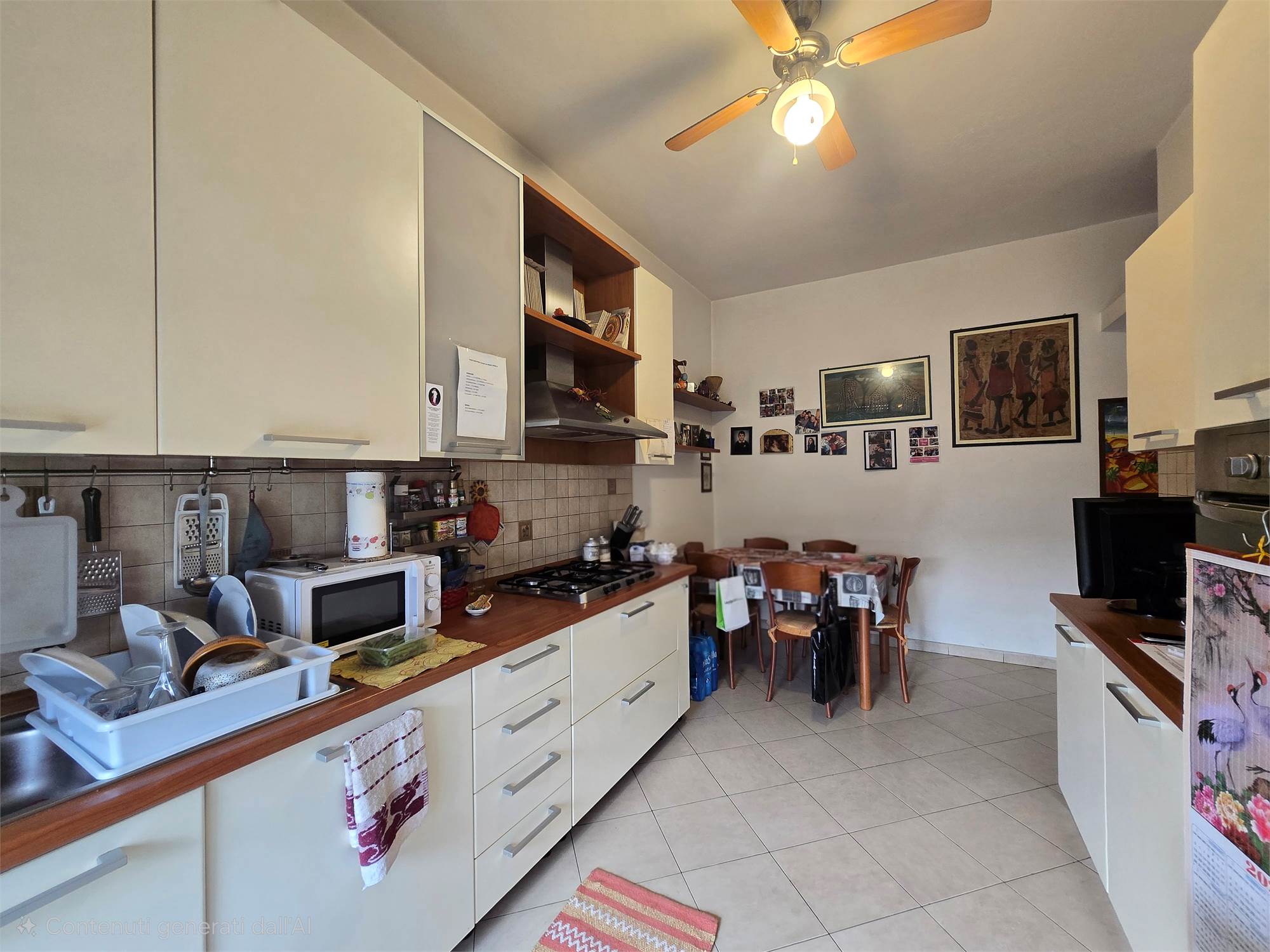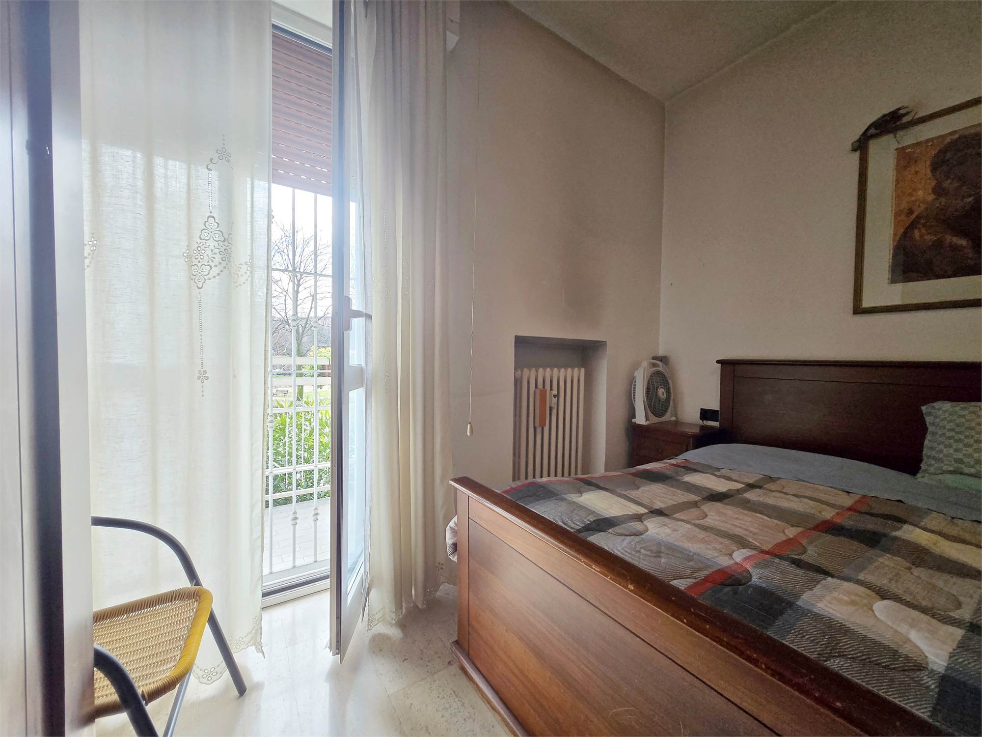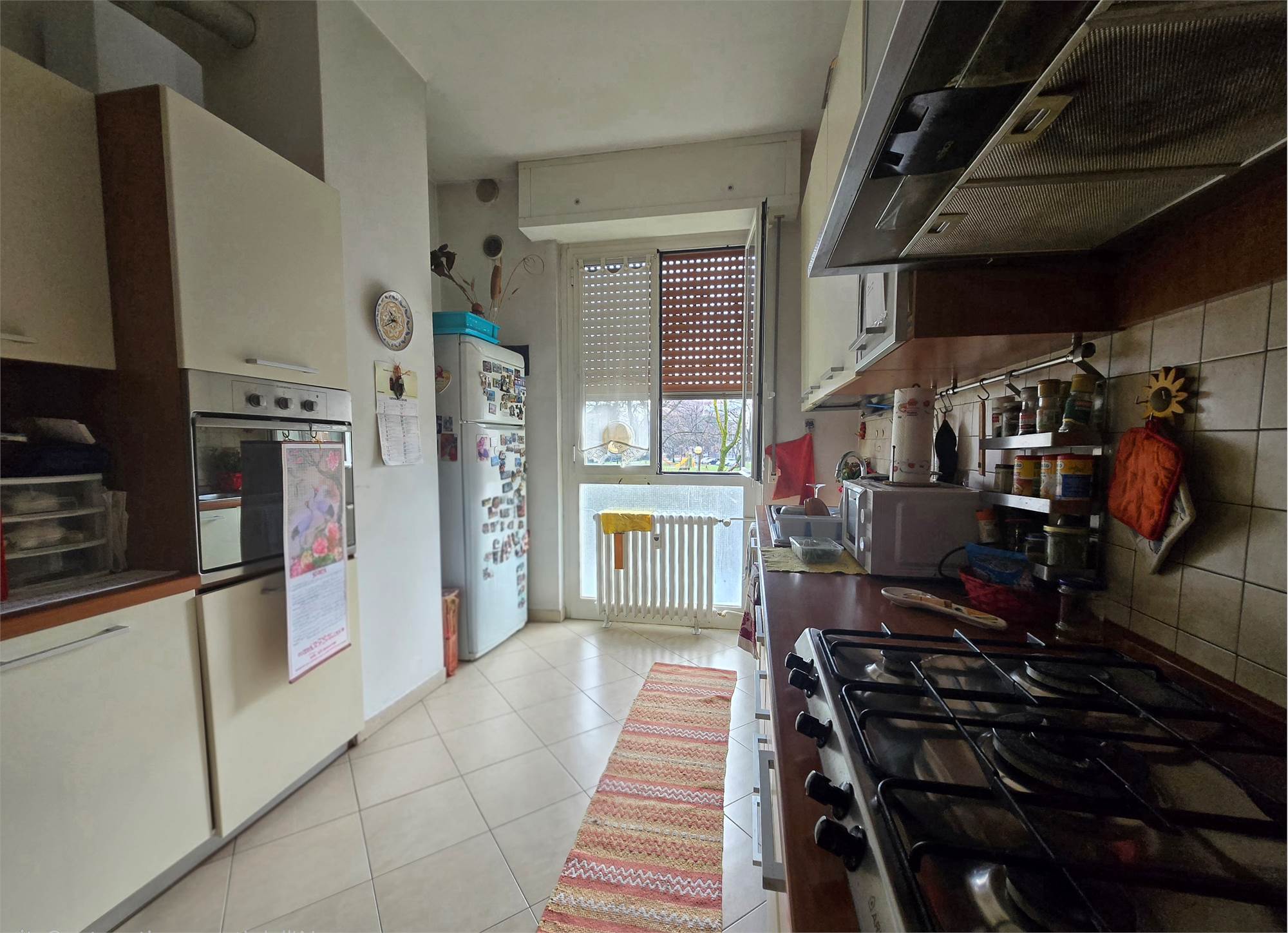 La cucina è abitabile, spaziosa e separata dal soggiorno. La zona notte è composta da una camera matrimoniale di generose dimensioni, con accesso diretto al balcone dotato di inferiata. Il bagno, disposto in lunghezza, è completo di doccia.